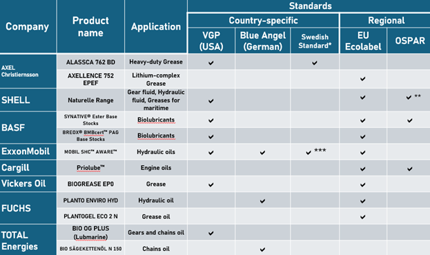 Country-specific standards include US BioPreferred Program which, as the name suggests focusses, mainly on the renewability aspect of bio lubricants having established a minimum of 72% bio-based content for multipurpose grease, 44% for hydraulic oil, 34% for two-cycle engine oil 17 17 DOD Sustainable Products Center (no date) DENIX. Available at: https://www.denix.osd.mil/spc/demonstrations/completed/btwceo/.