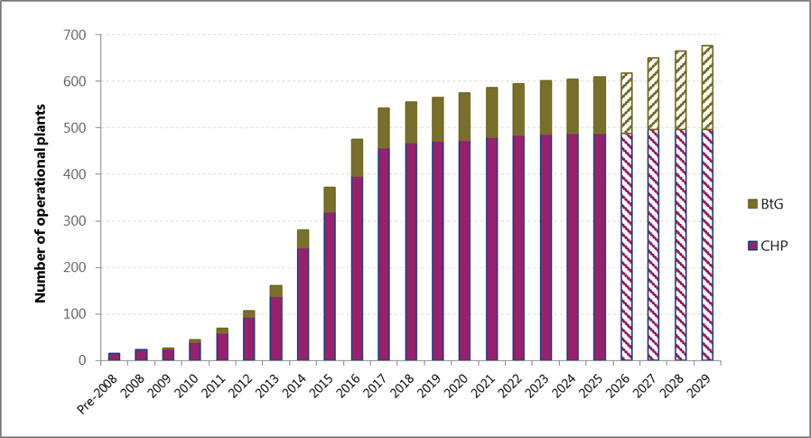 Figure 3: Cumulative number of Biomethane to Grid (BtG) AD plants (excluding water treatment plants) (2026-2029 forecasted) (Source: Alder BioInsights)